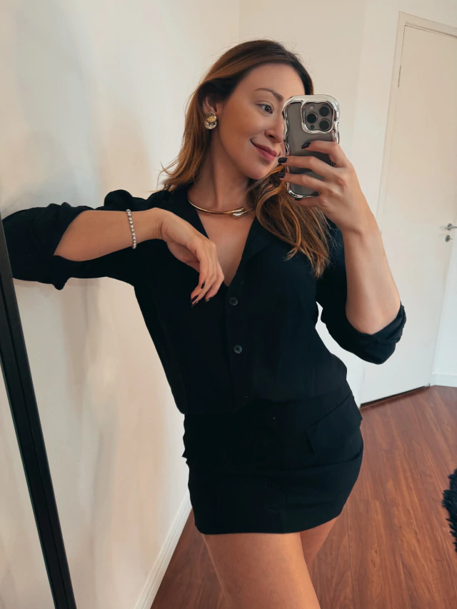 Nossa proposta foi trazer uma camisa tipo slim porque estava faltando na nossa coleção e ela ficou perfeita! Daquelas que podemos fazer um milhão de combinações sabe?