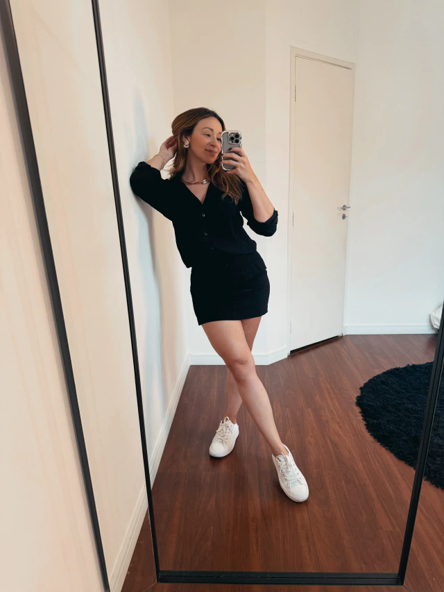 Já em baixo para quebrar um pouco a seriedade do look fizemos uma saia tcham, vibe de gostosa do jeito que amamos. Saia de corte tipo reto, com bolsos pra dar um charme e elástico no cos atrás para vestir bem sem precisar de ajuste!
