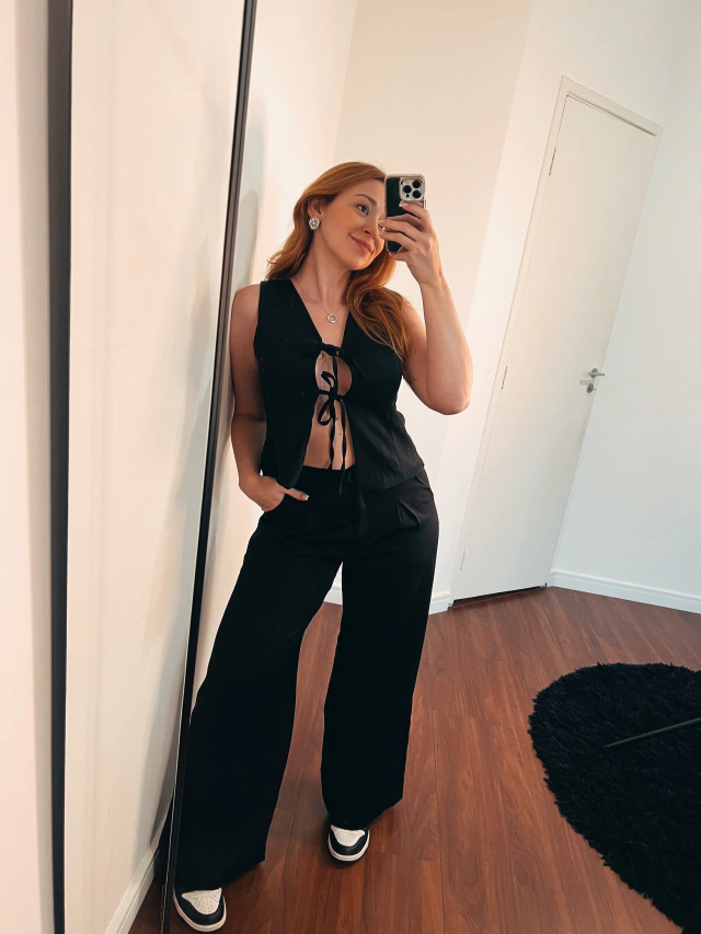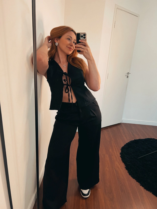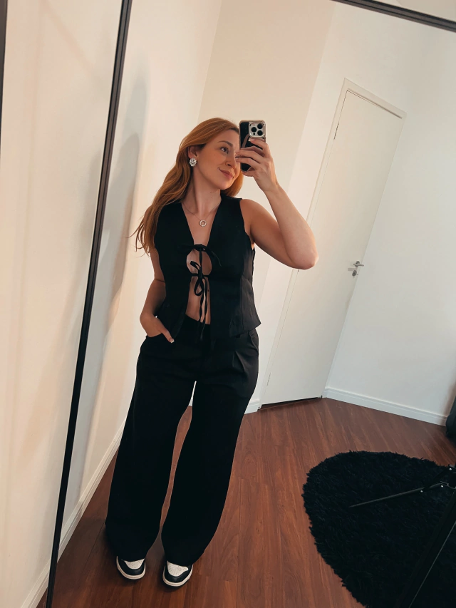 A mistura da nossa febre por alfaiataria com a tendência da Gringa de blusinhas de amarrar fez esse colete PERFEITO, super estiloso e bem de grande gostosa né?