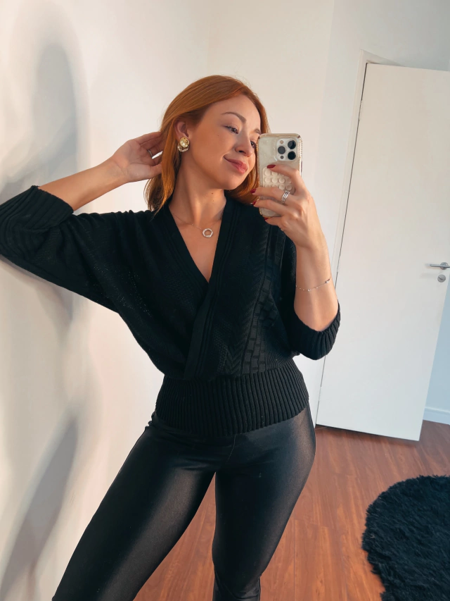 Tricot de linha super macia e confortável, modelo transpassado,todo trabalhado, mais justinho em baixo e nos punhos, com manga mais laguinha. Possui detalhe nas costas para deixar o transpassado certinho. Possui botao no decote para fechar mais se necessário. Tricot estica bastante.