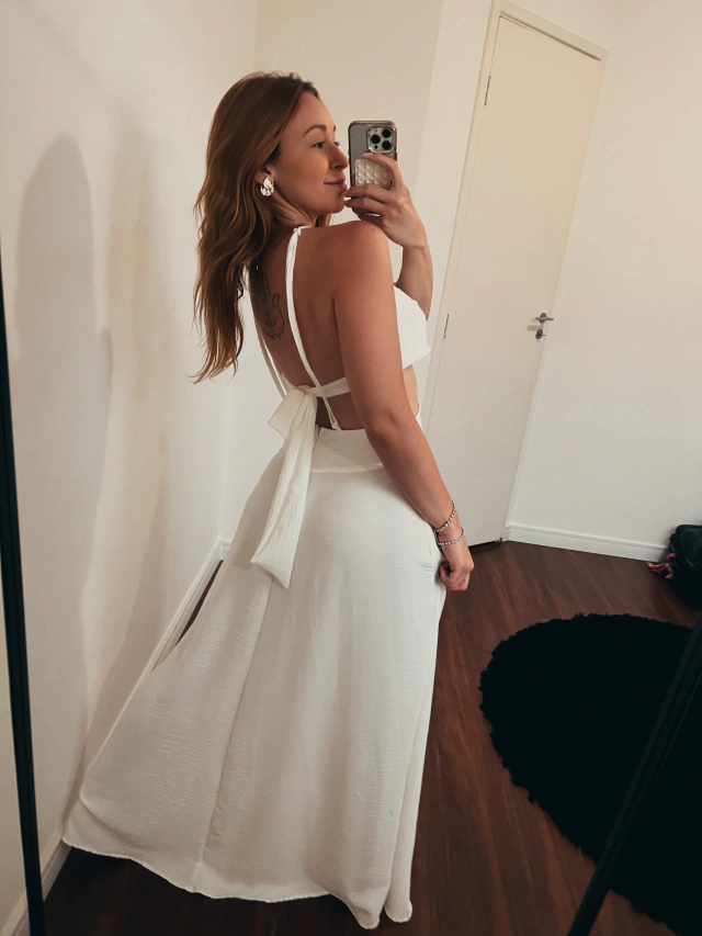 Busto franzido, regulável, com amarração atrás pra você deixar certinho em você! Saia com zíper invisível pra vestir bem.